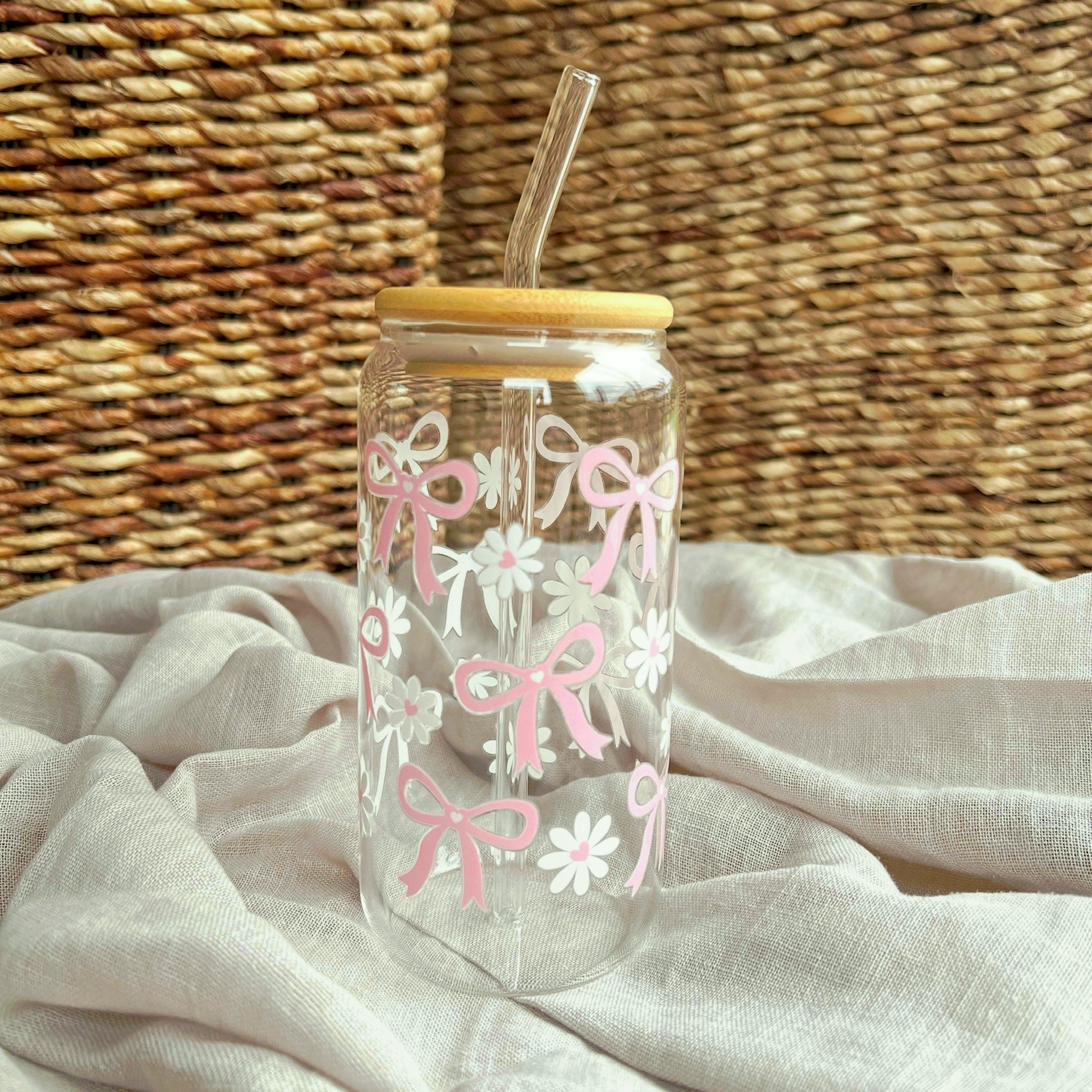Gobelet en verre avec paille en verre et couvercle en bambou - Nœuds modèle 2
