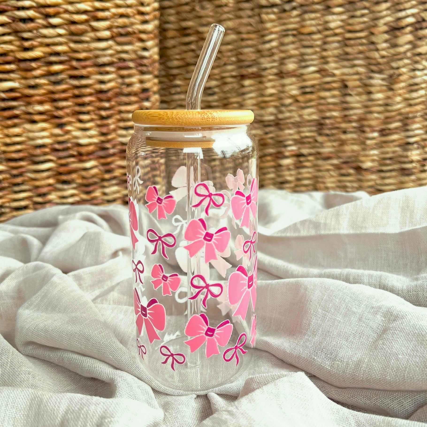 Gobelet en verre avec paille en verre et couvercle en bambou - Nœuds modèle 3