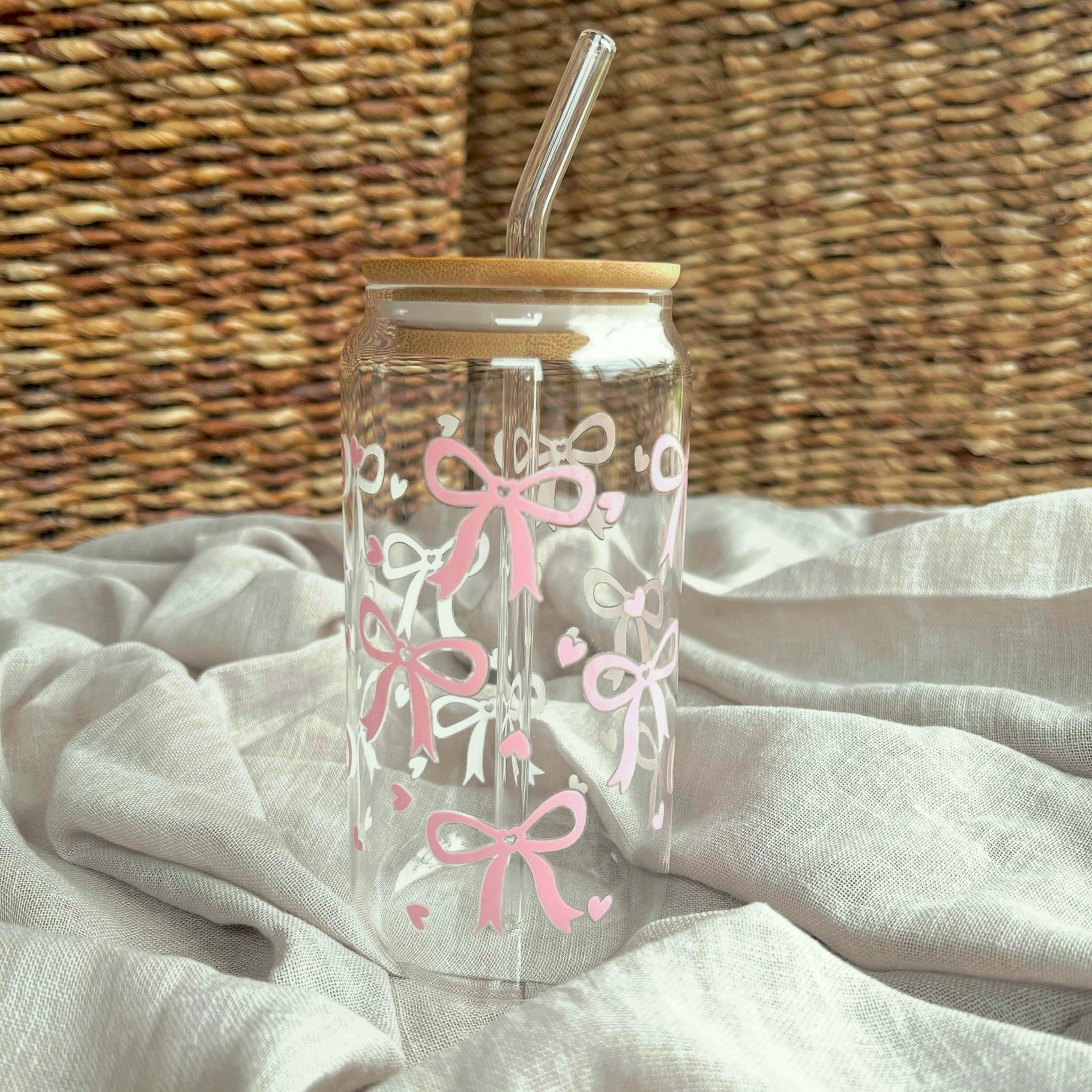 Gobelet en verre avec paille en verre et couvercle en bambou - Nœuds modèle 4