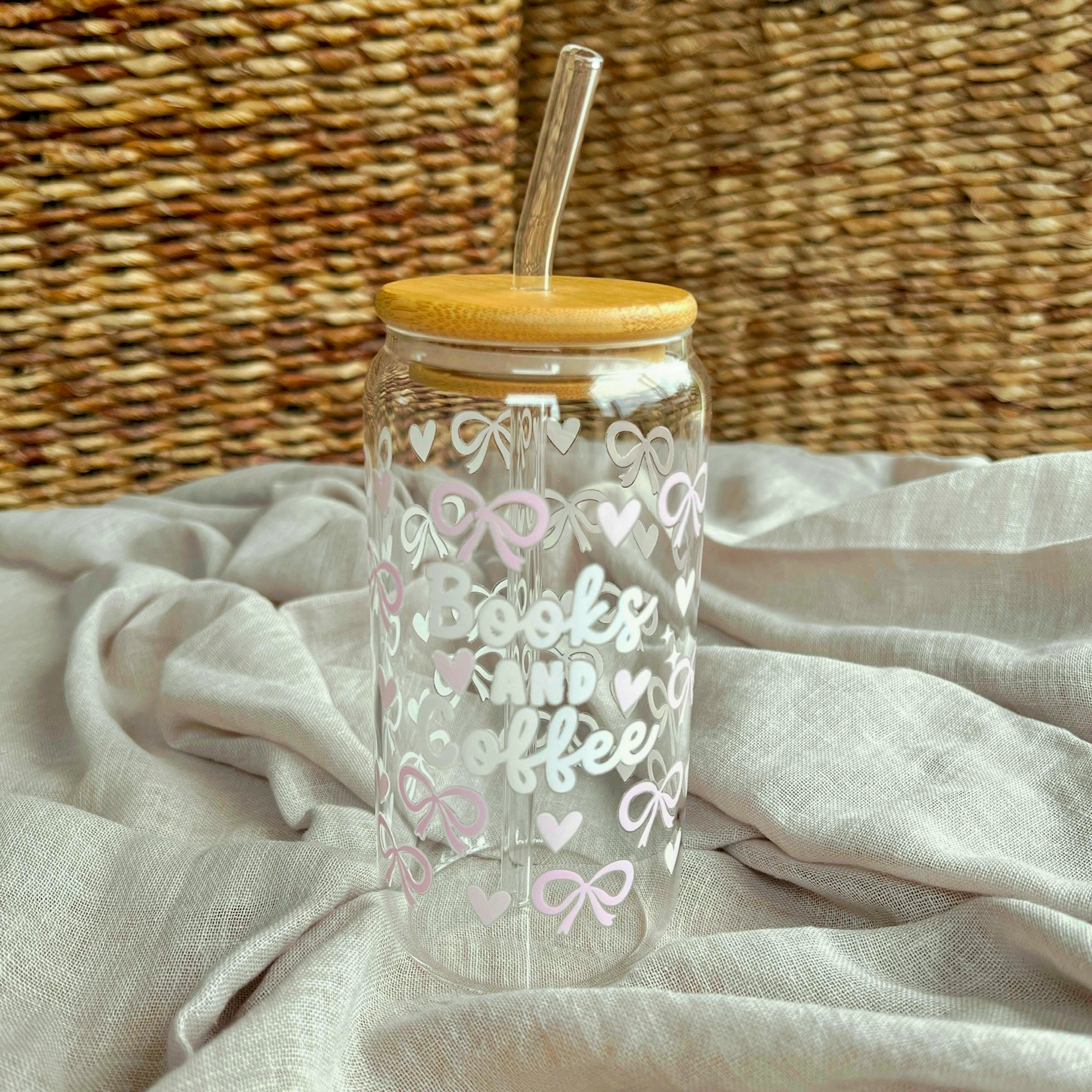 Gobelet en verre avec paille en verre et couvercle en bambou - Nœuds modèle 7